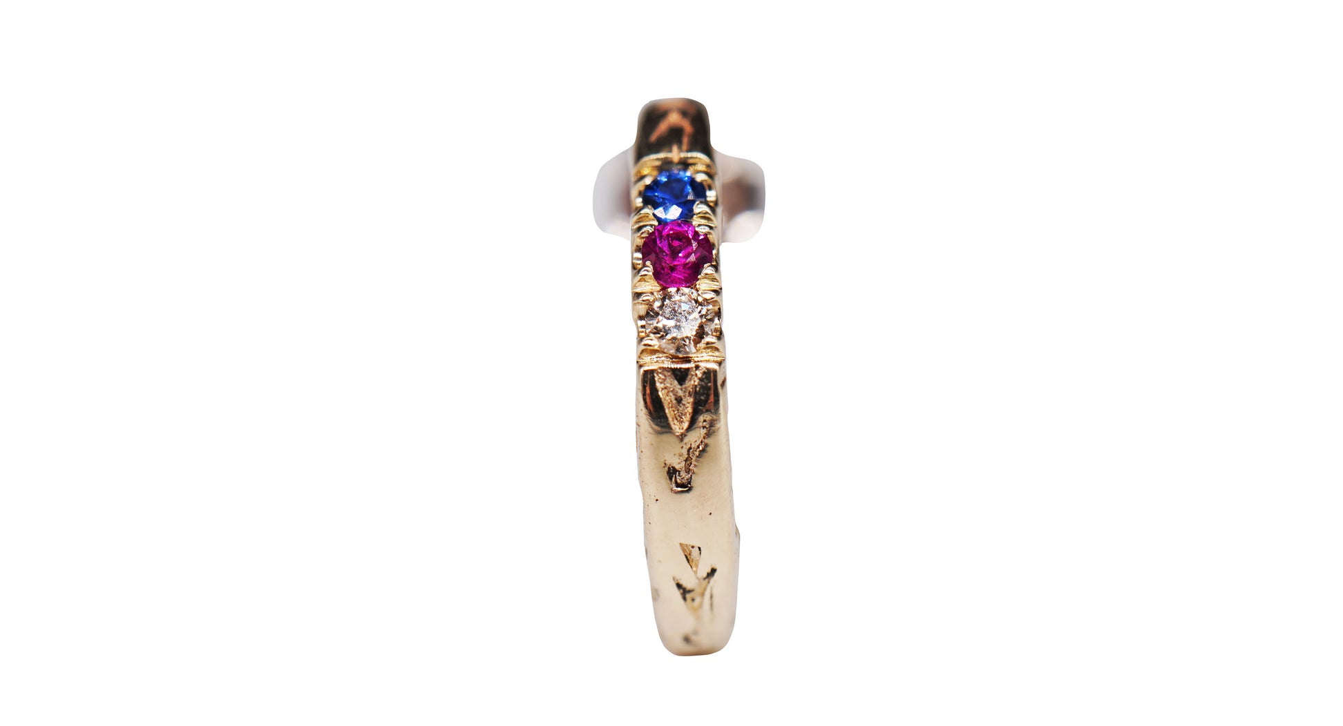 Fascia larga 2 mm in oro 9k con tre pietre preziose.