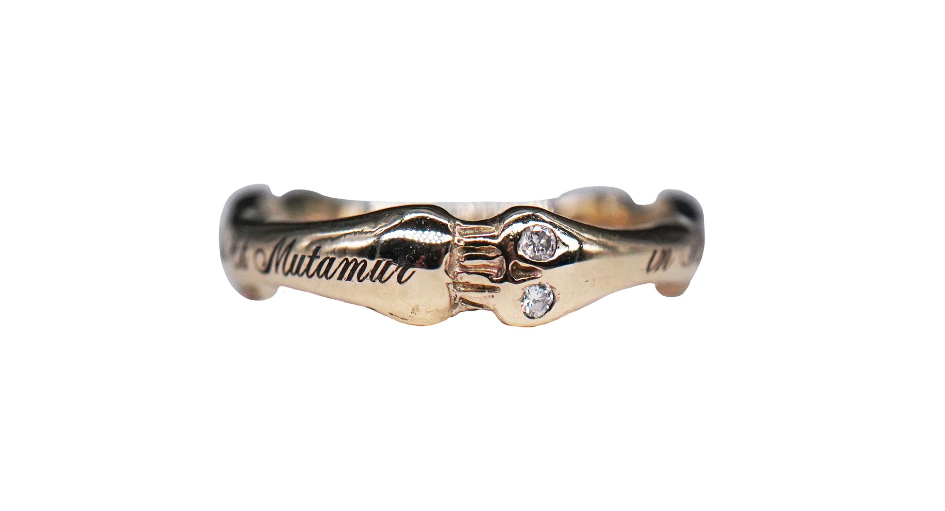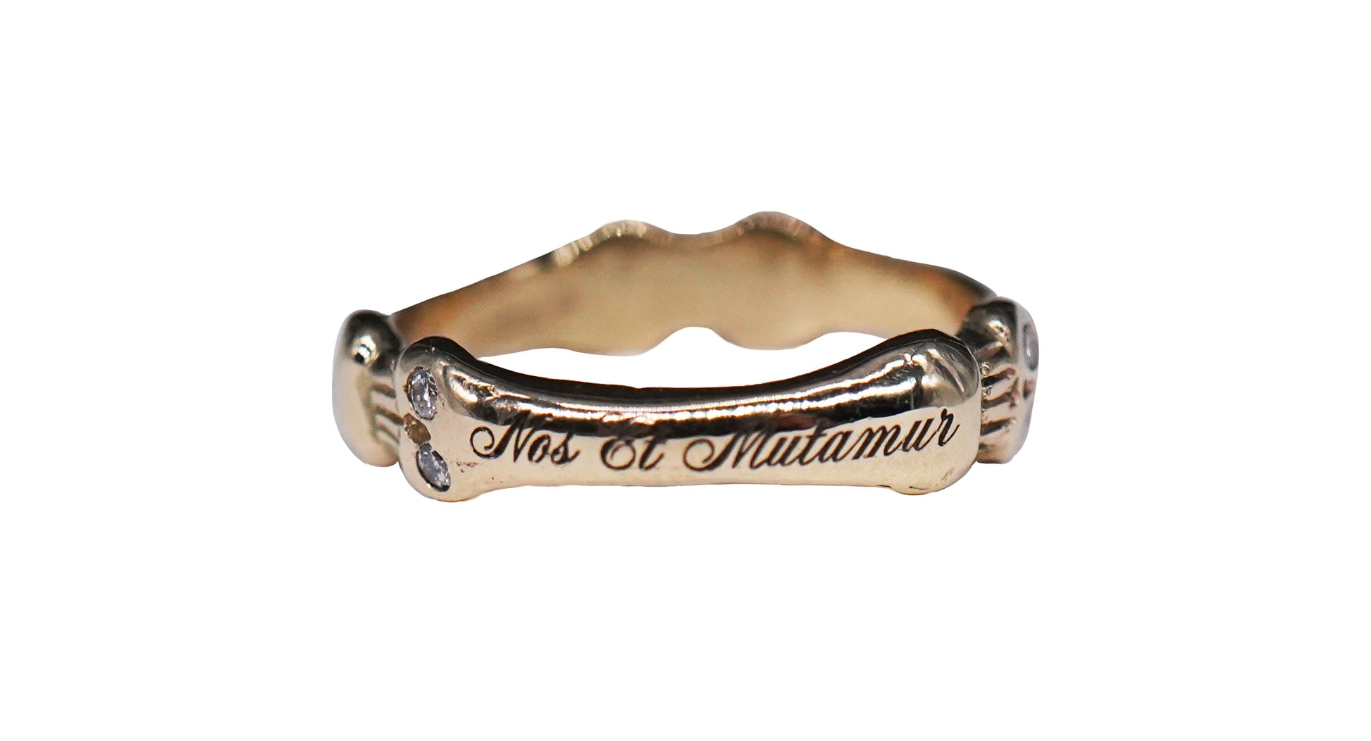 Fede in oro giallo 9k con diamanti bianchi taglio brillante per un totale di circa 0,10 ct e incisione latina: "OMNIA MUTANTUR NOS ET MUTAMUR IN ILLIS" — Tutto cambia, e noi cambiamo con esso.