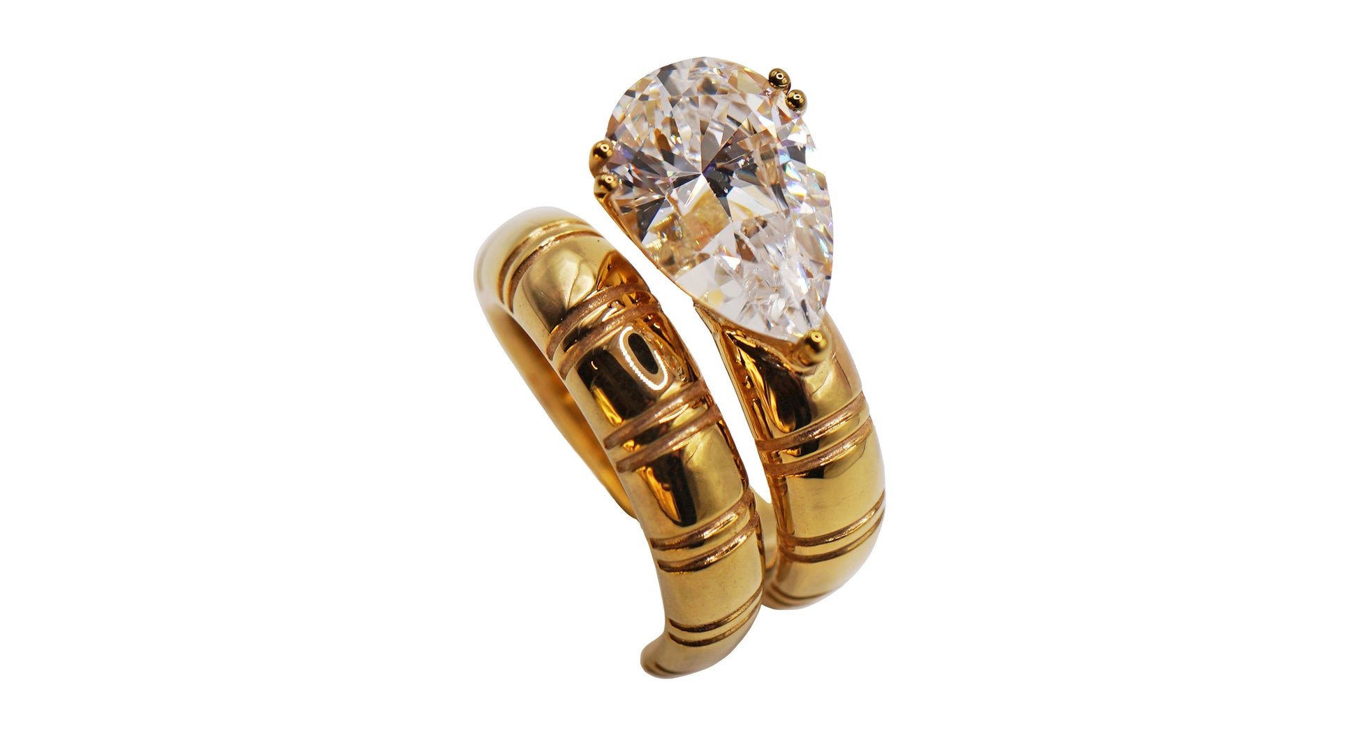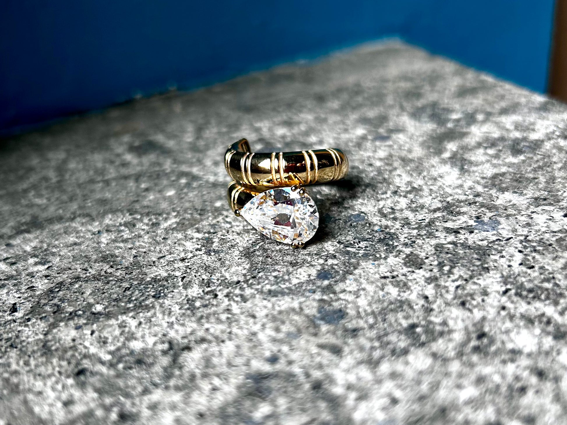 Fascia completa in bronzo giallo placcato oro 18 carati che avvolge il dito e una goccia di  Duralite incastonata in una testa in bronzo placcato oro 18 carati che risalta su tutto