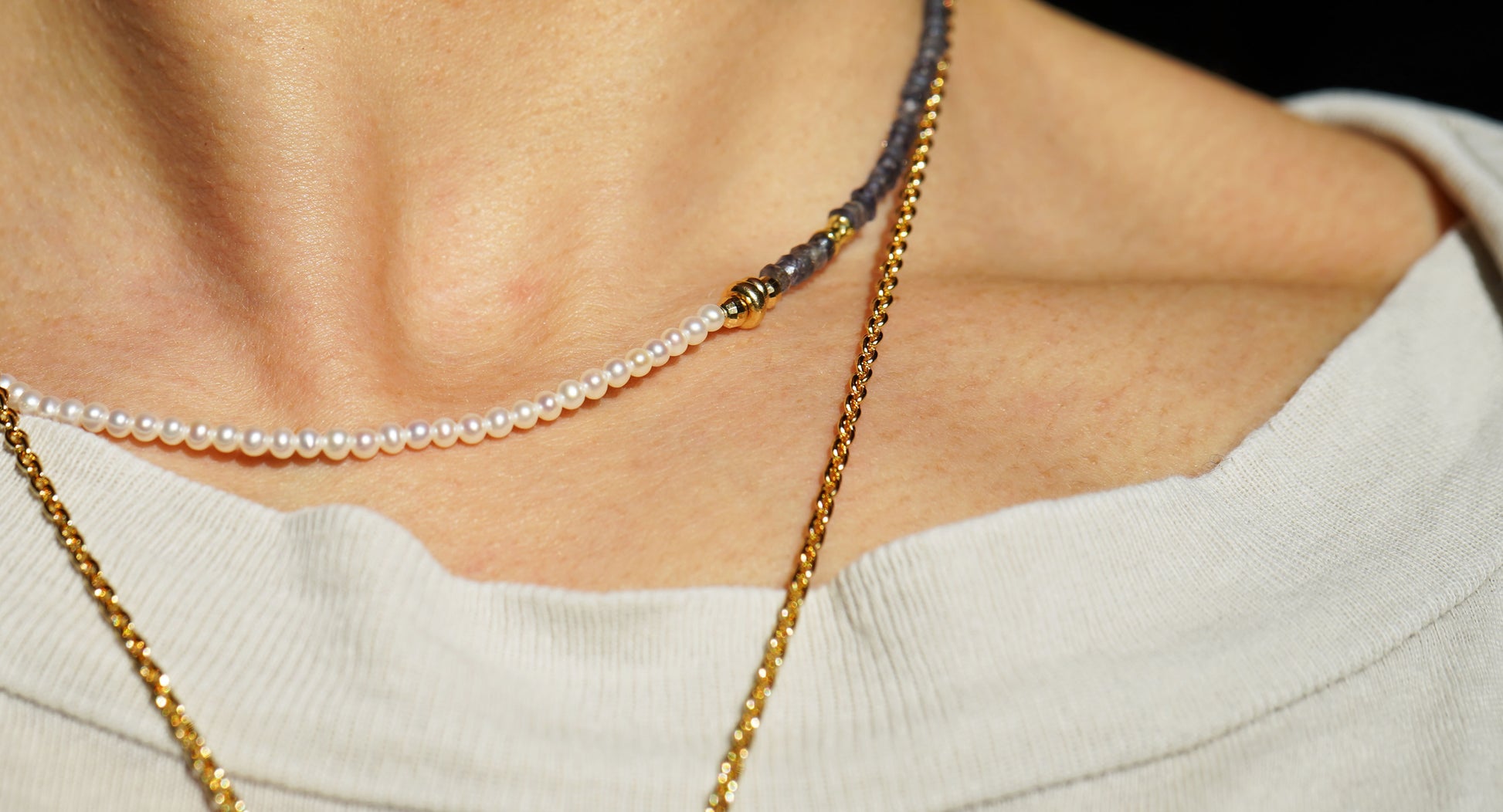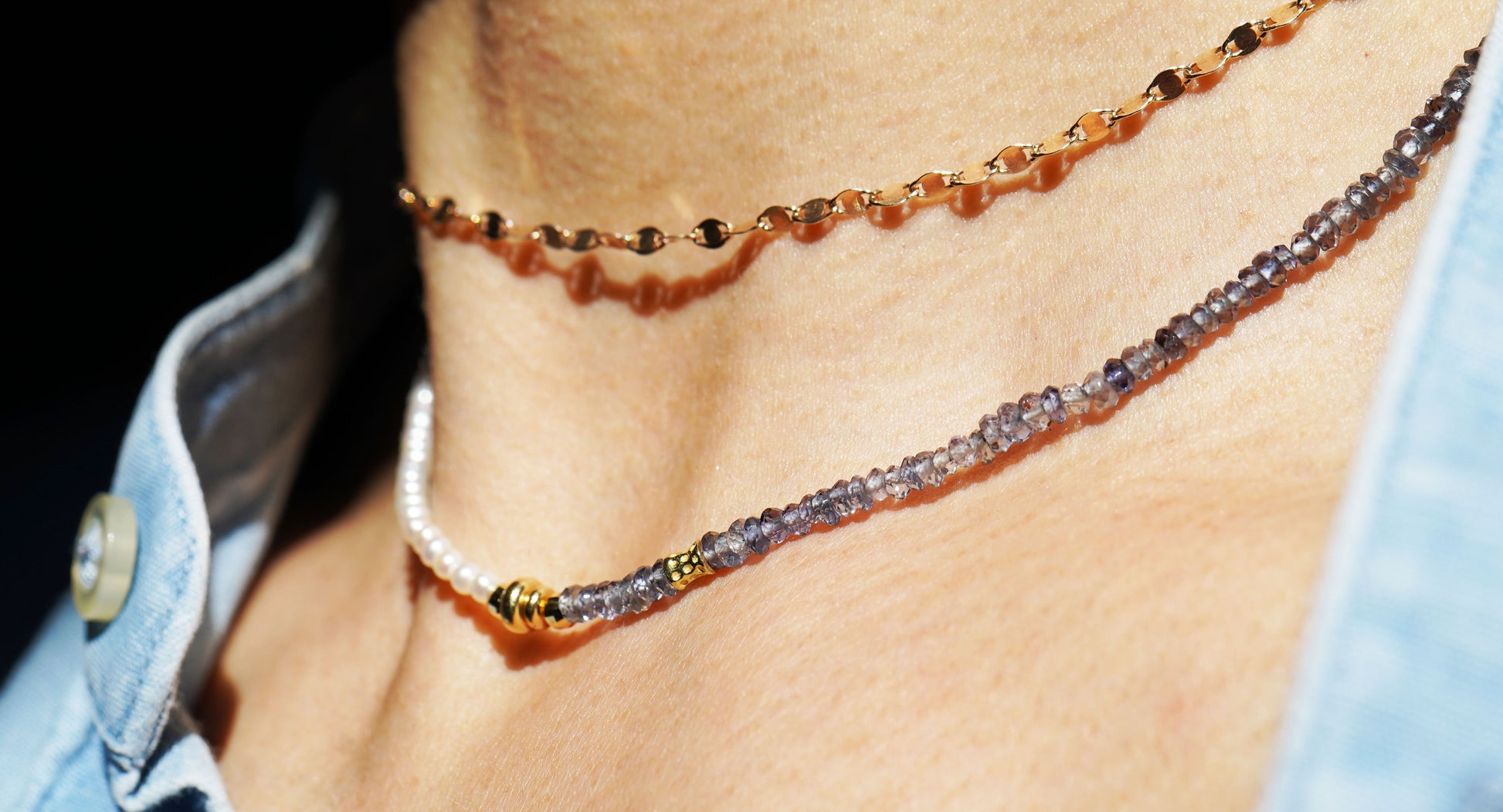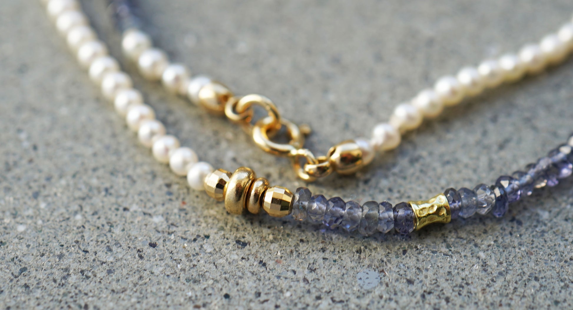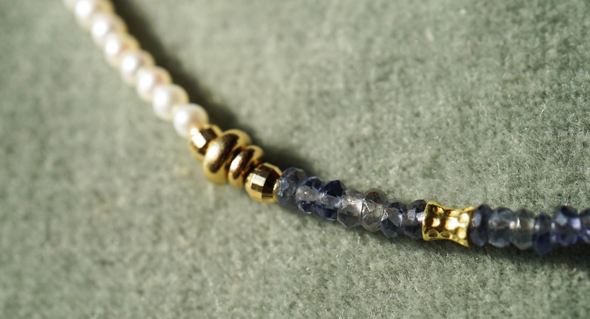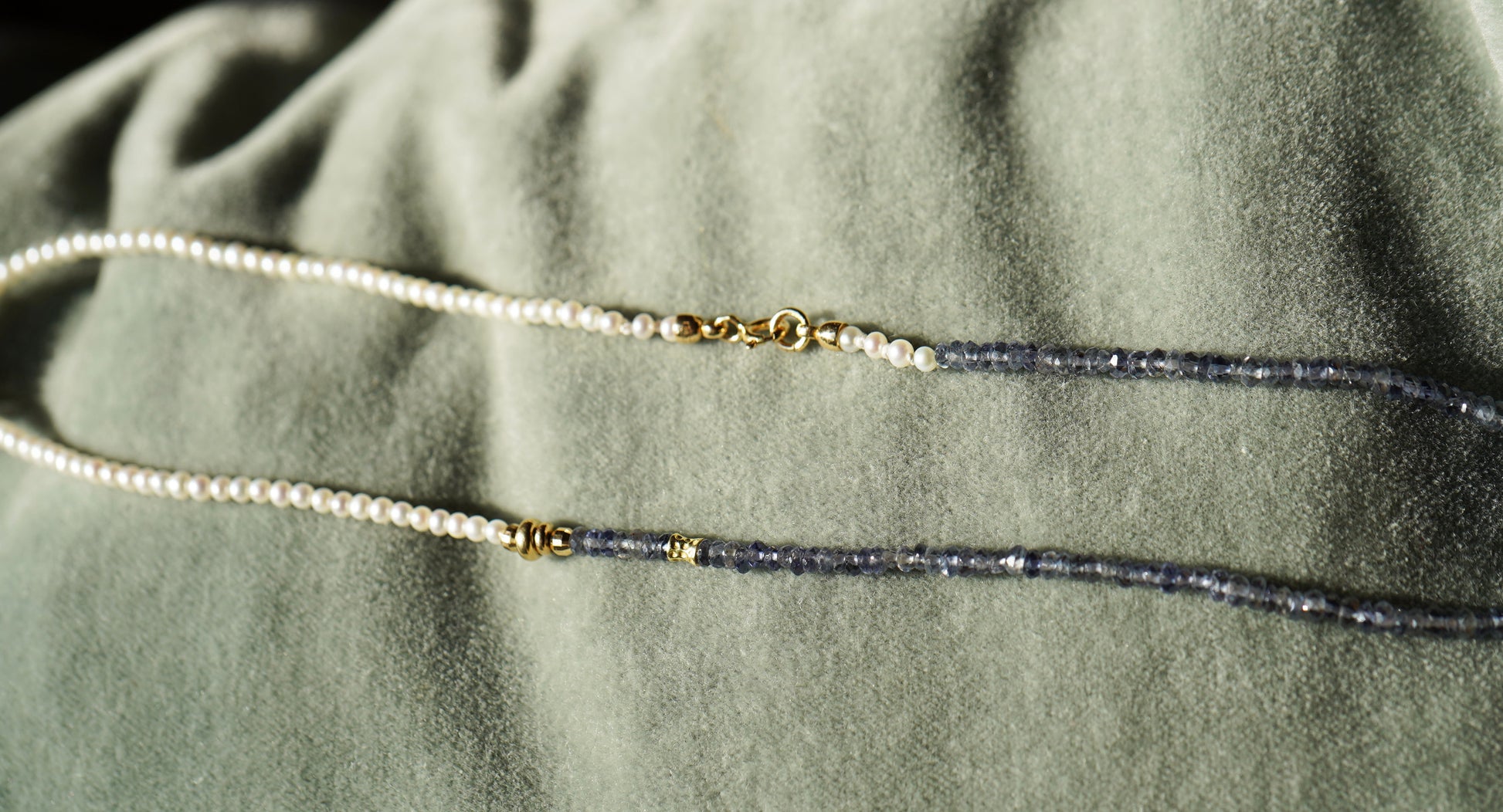 Un filo di perle e ioliti interrotto da ornamenti in puro oro 18 carati.