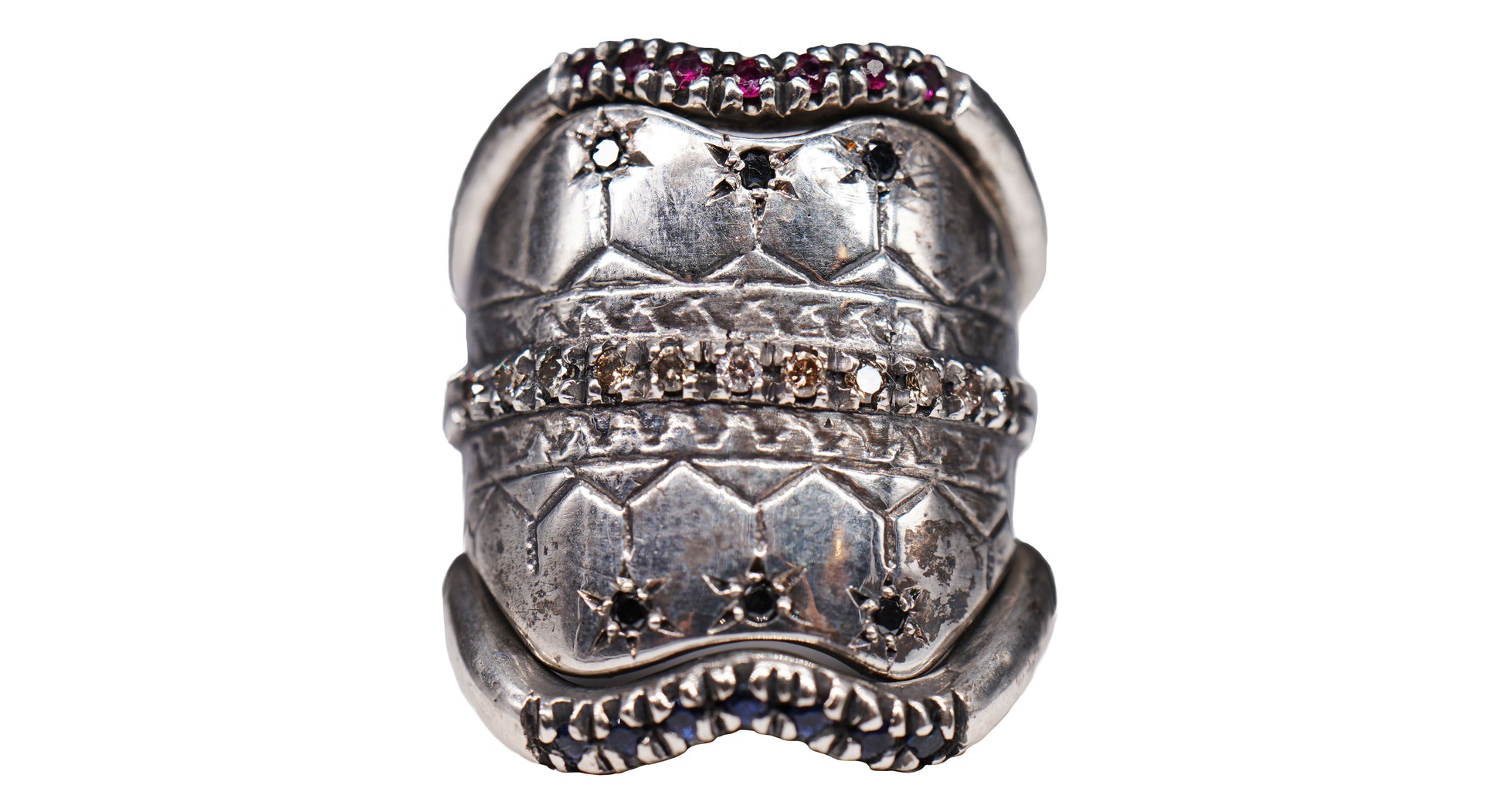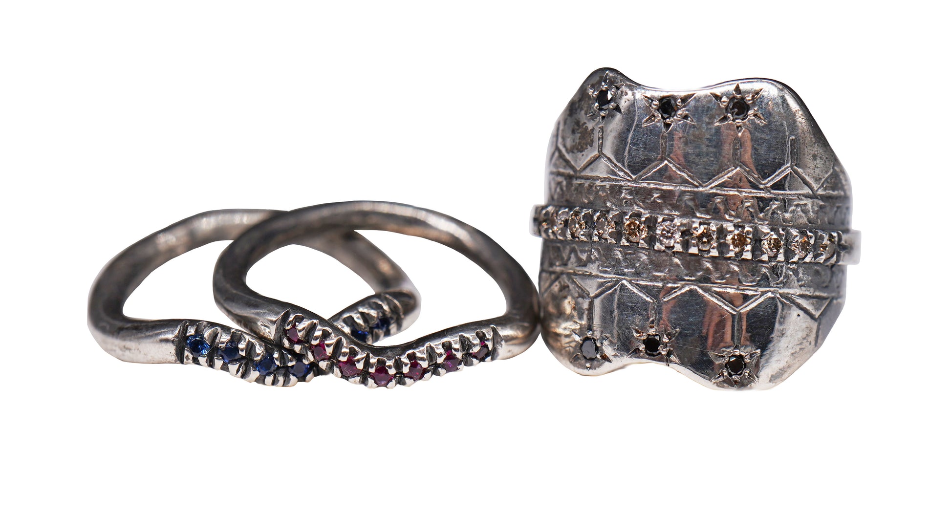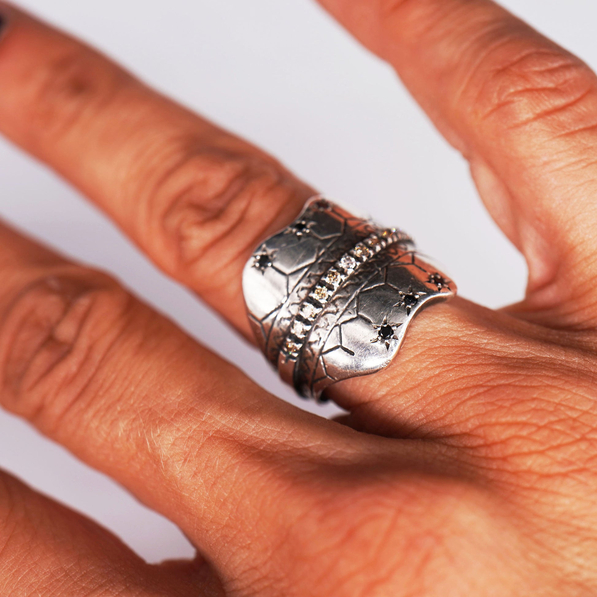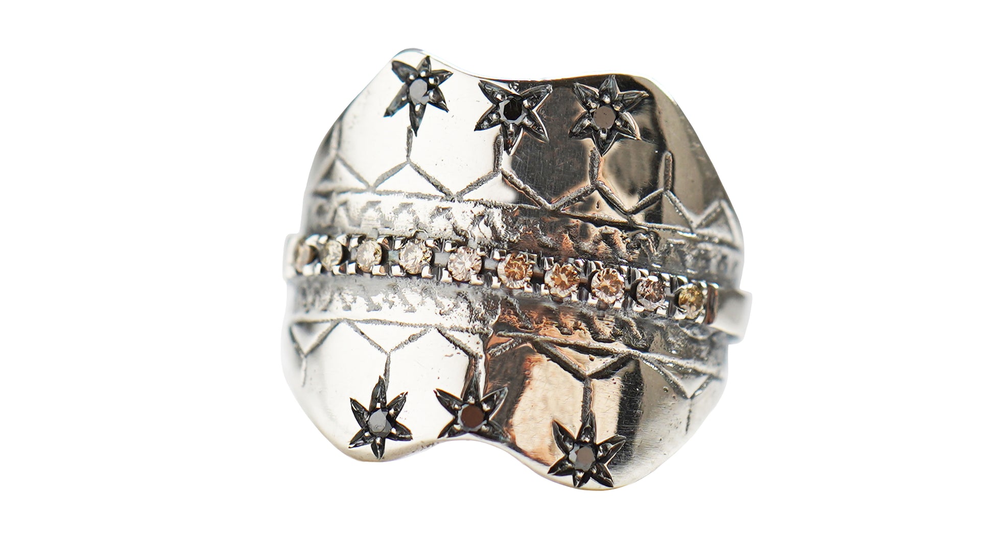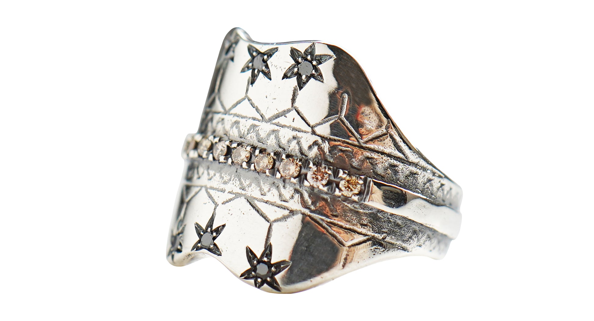 L'anello Roanoke è uno scudo in argento con diamanti color cognac e neri da circa 0,25 ct.