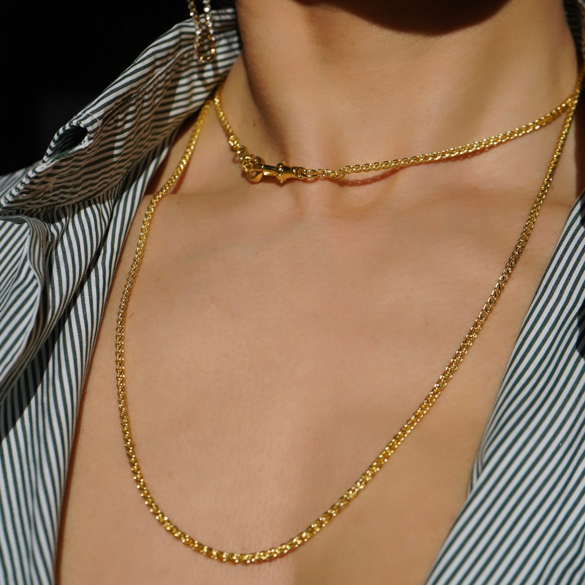 100 centimetri di catena uniti da due moschettoni in cui riporre tutti i ricordi importanti e d'Amore . Puoi lasciarla lunga o farla girare due volte intorno al collo.