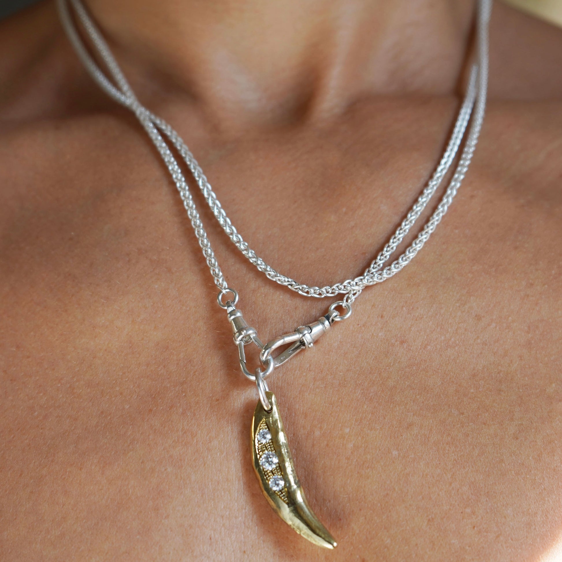 100 centimetri di catena uniti da due moschettoni in cui riporre tutti i ricordi importanti e d'Amore . Puoi lasciarla lunga o fare due giri attorno al collo.