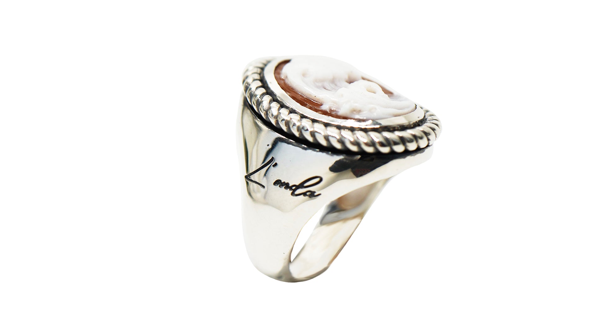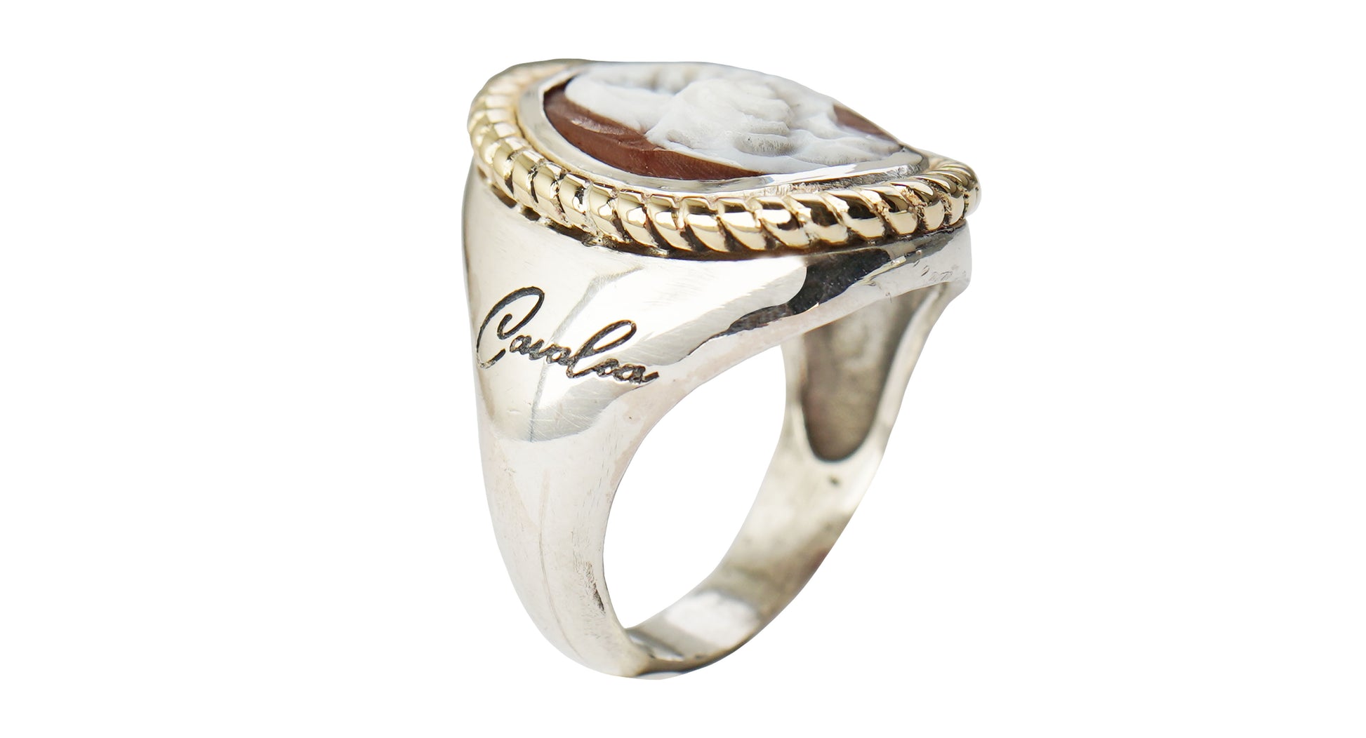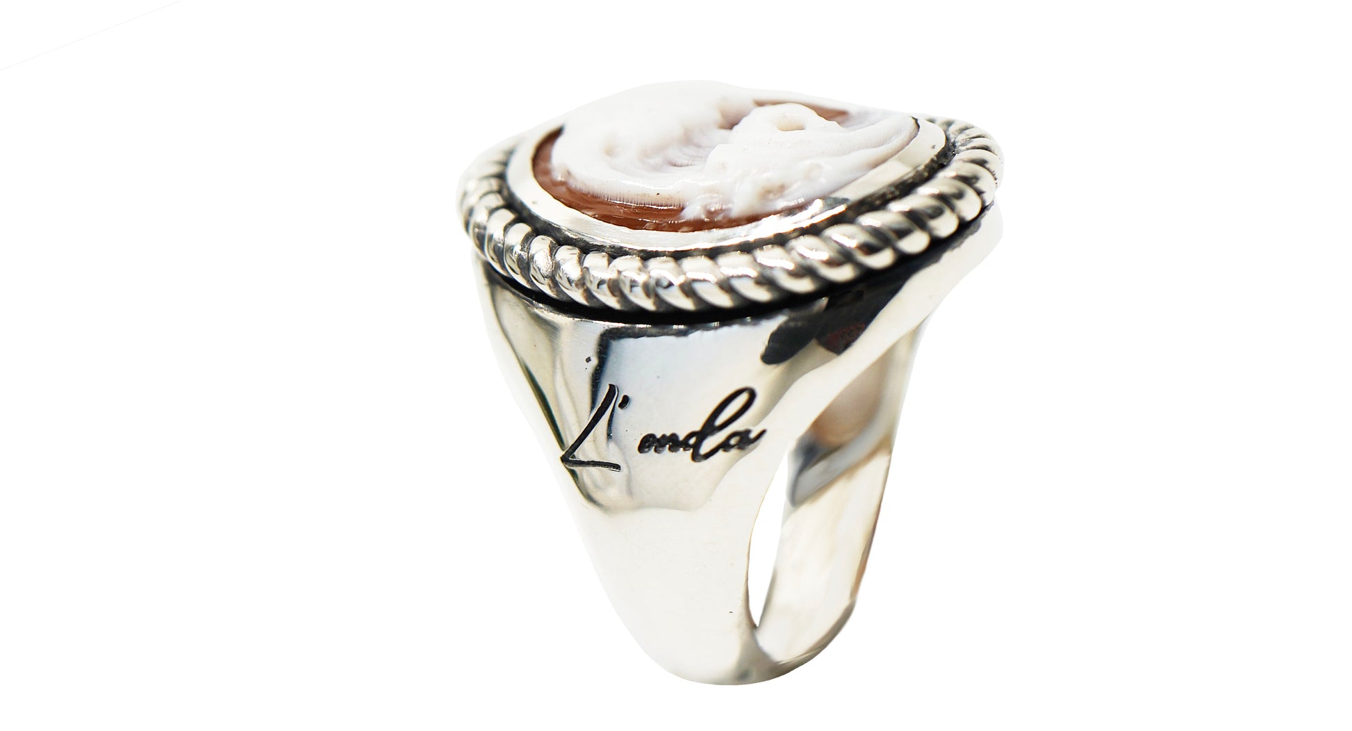 Un Cammeo inciso a mano su conchiglia sardonica con un disegno creato in esclusiva per Veronica Altieri dagli artigiani di Torre de Greco.