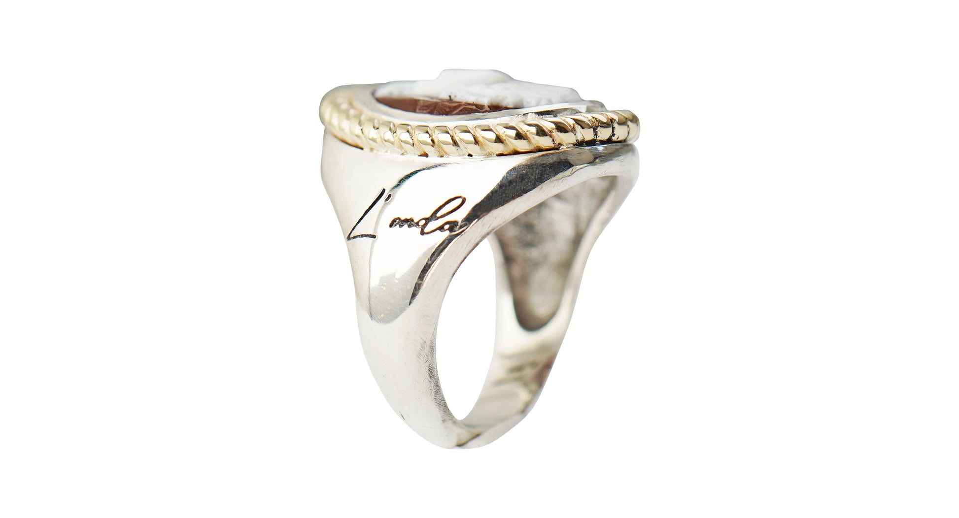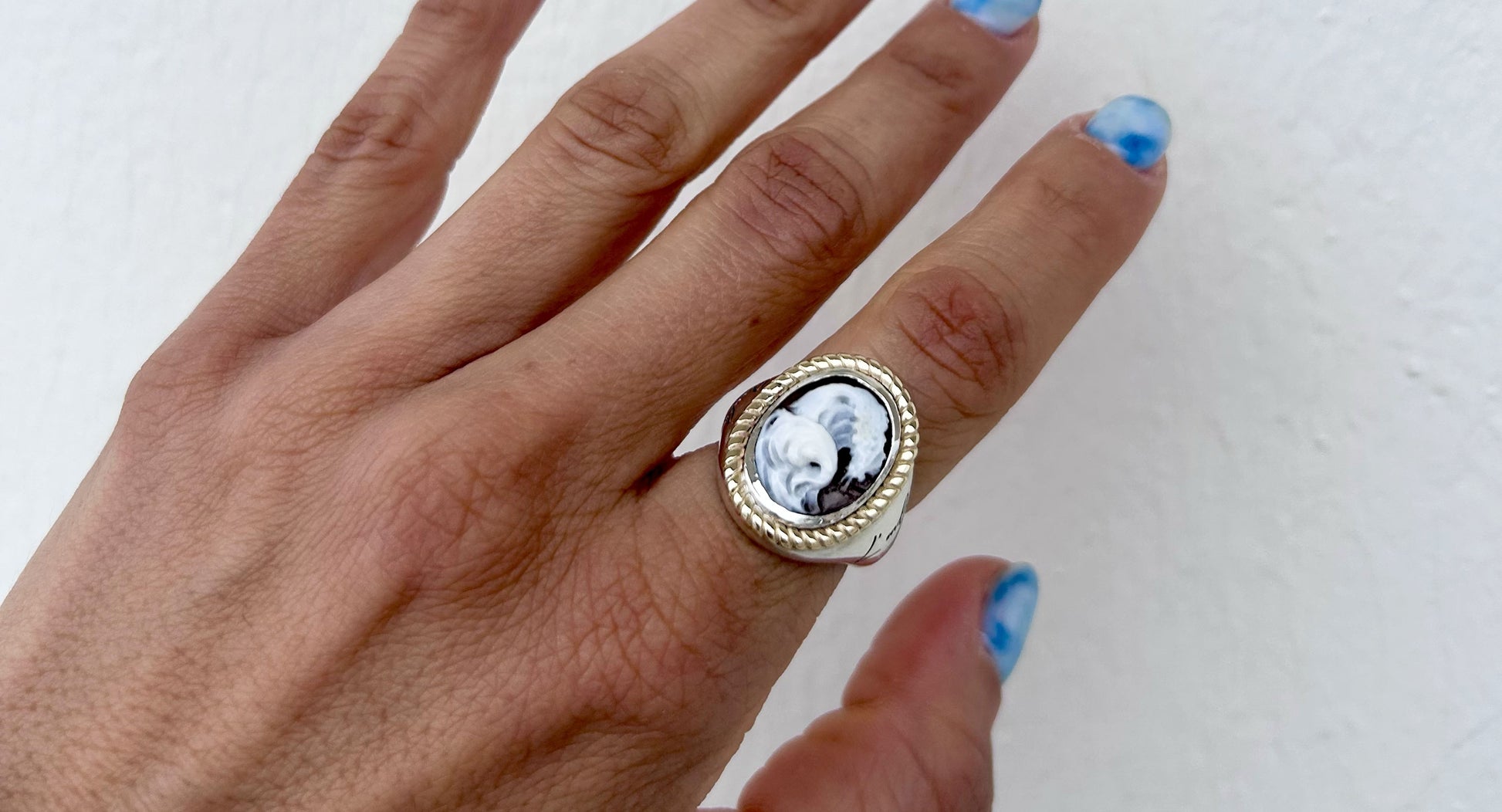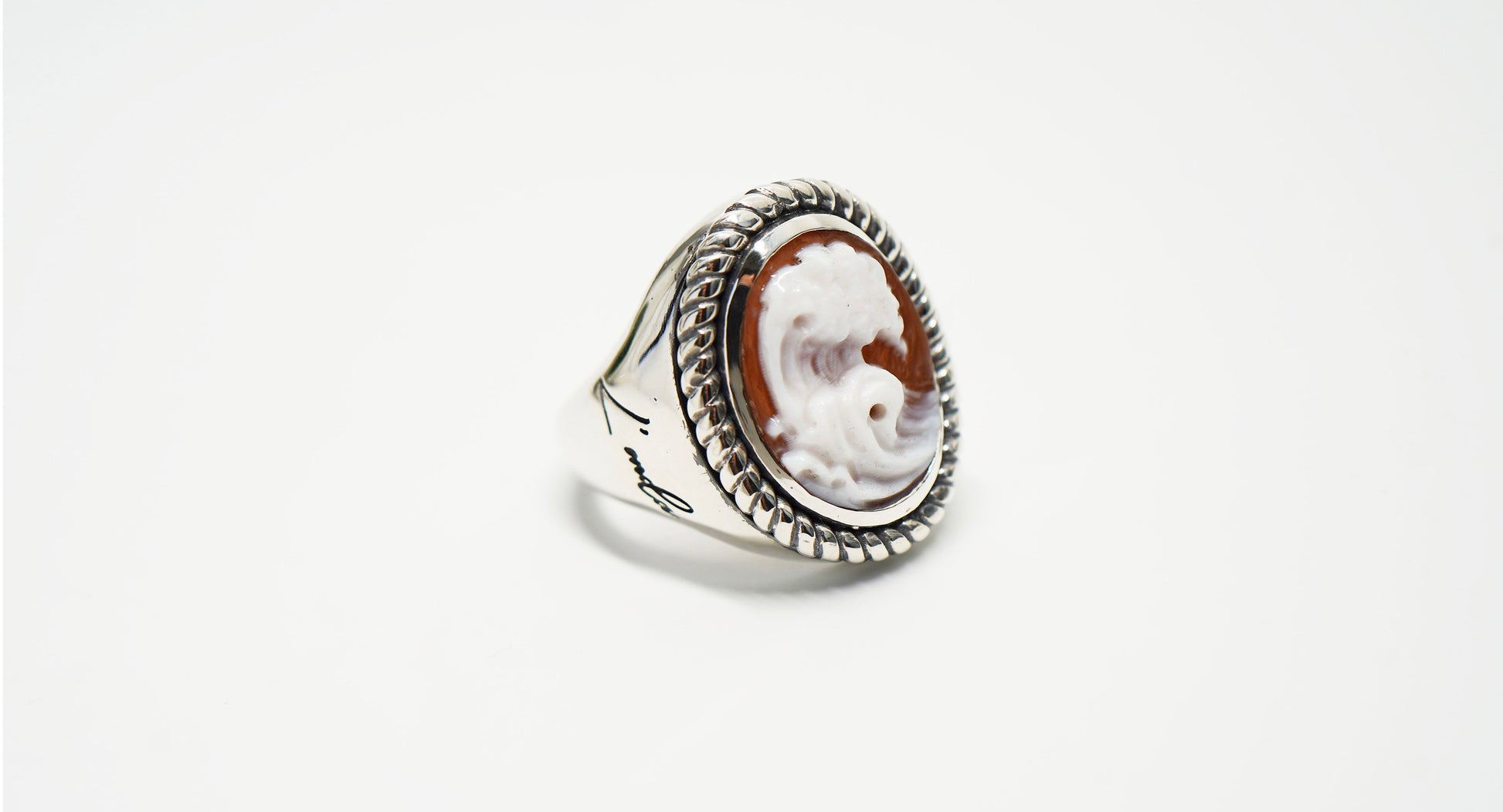 Un Cammeo inciso a mano su conchiglia sardonica con un disegno creato in esclusiva per Veronica Altieri dagli artigiani di Torre de Greco.